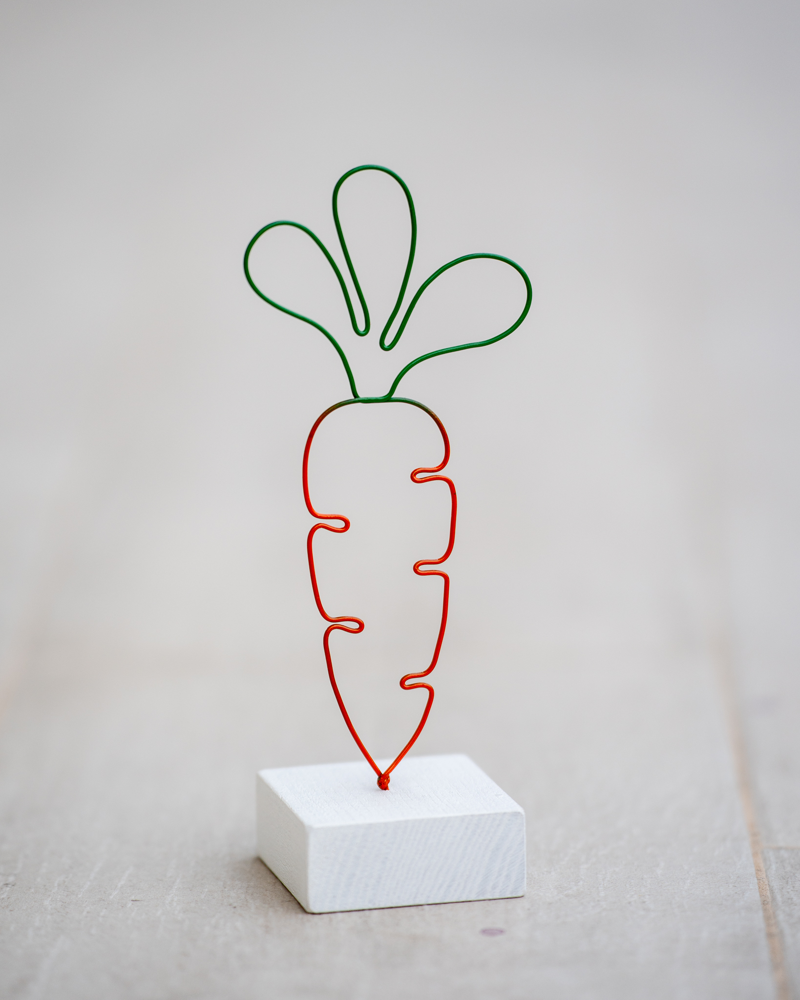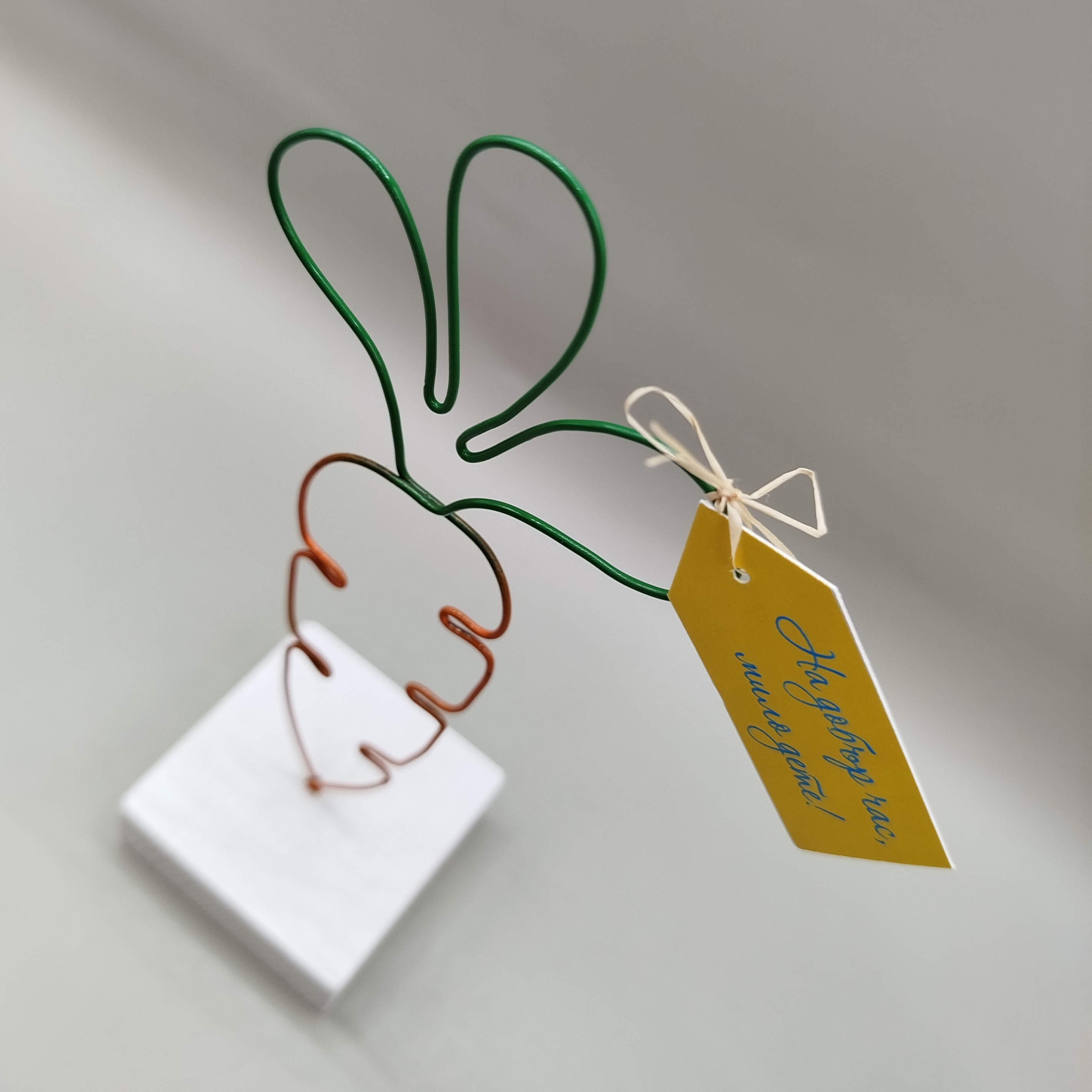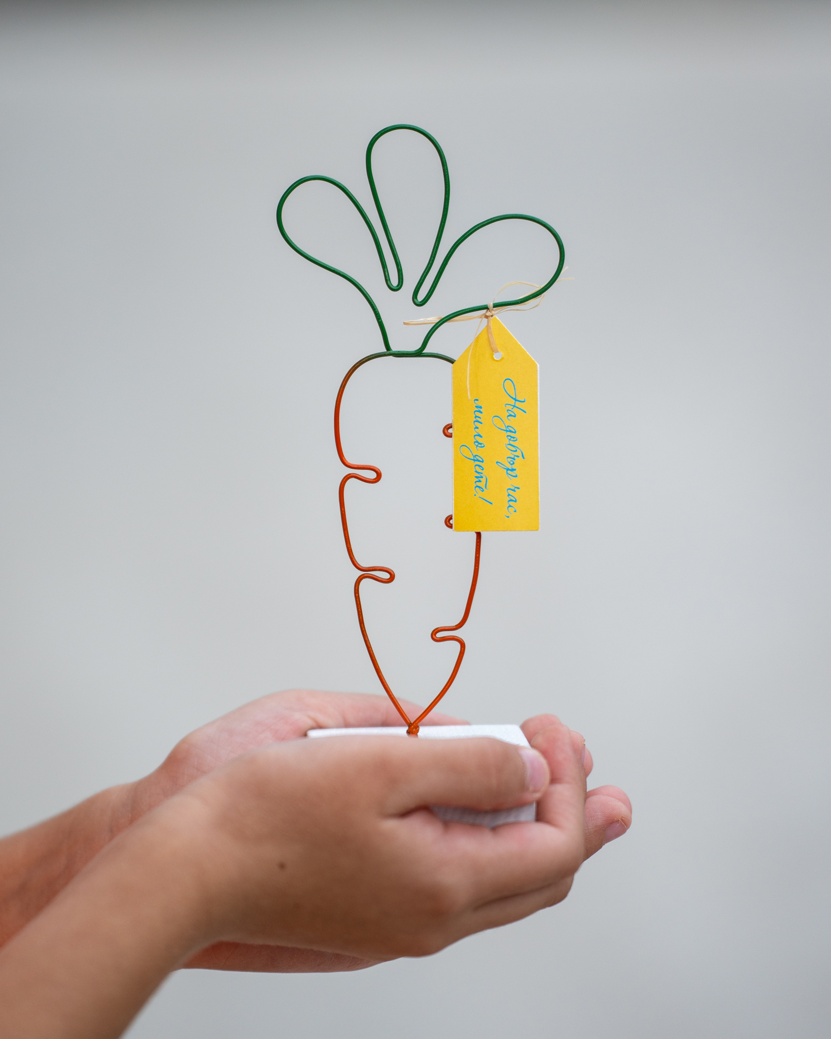 Изработено от една непрекъсната линия стоманена тел и оцветено в свежо оранжево и зелено, това морковче носи усмивка и послание: „На добър час, мило дете!“.